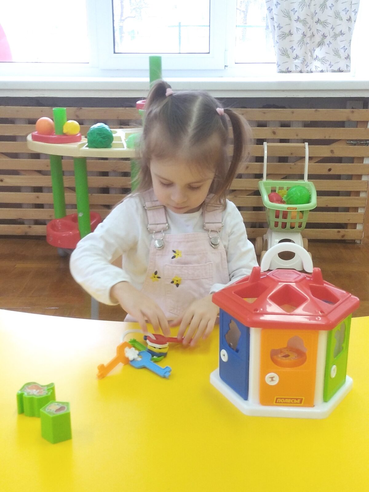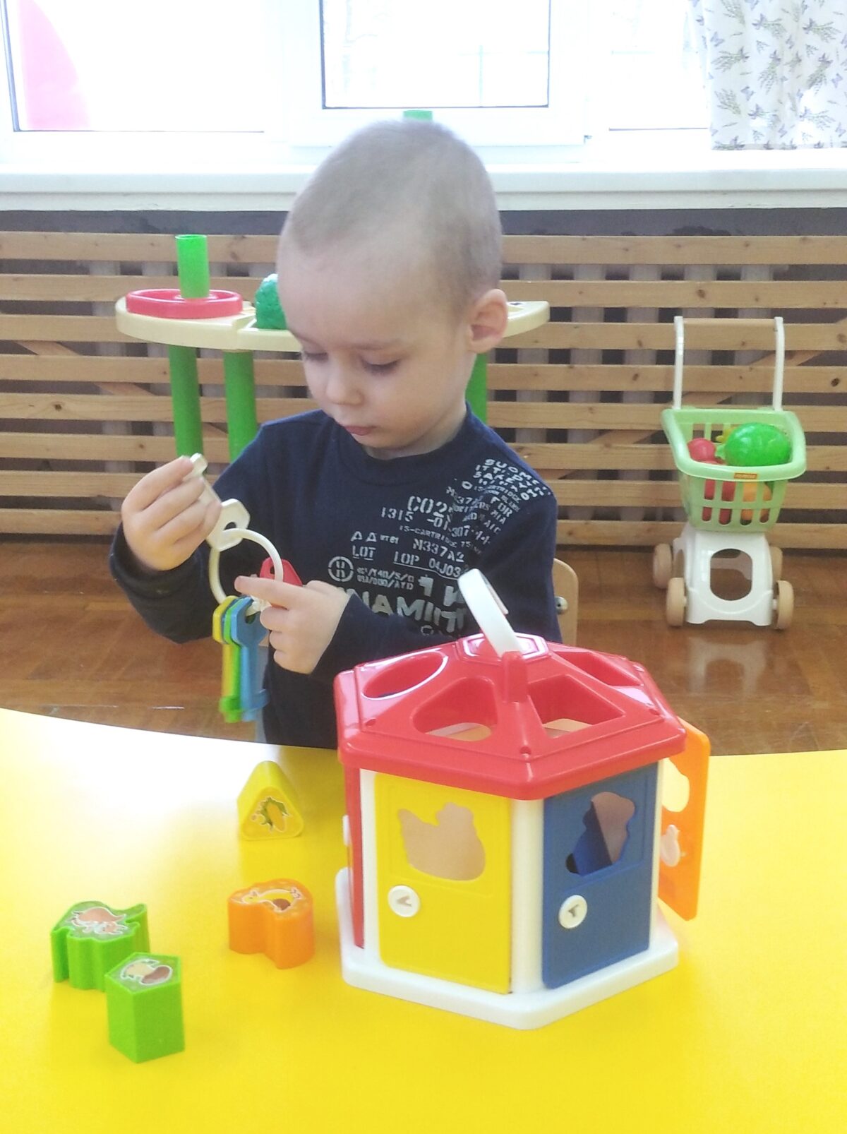 Малыши с интересом открывают и закрывают ключиками дверцы домика, подбирают фигурки к окошкам. Так, белочка получает грибок, собачка – косточку, а рыбка – своего червячка.